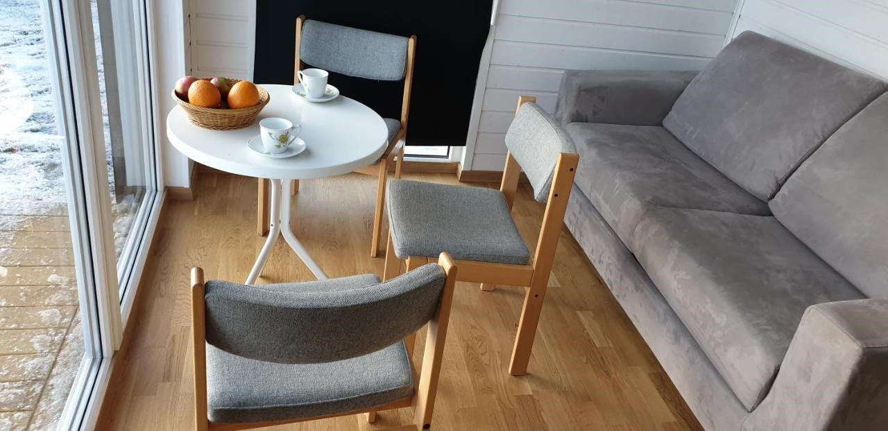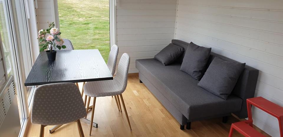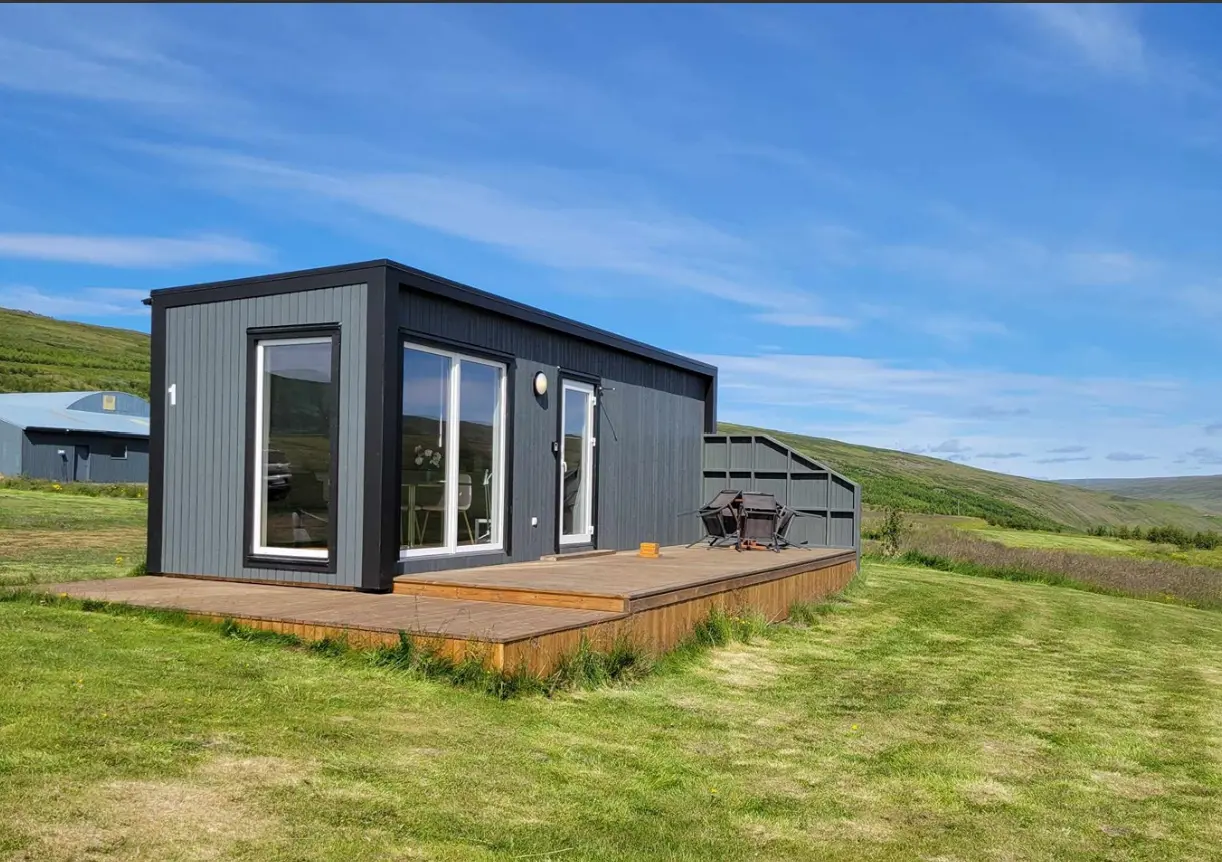 A cabin with one bedroom featuring a double bed, a bathroom with a shower, and a seating area with a kitchenette. The seating area includes a sofa bed, and the cabin can accommodate up to 4 people. A terrace with a sitting area and view. A comfortable house located right at the edge of Stuðlagil Canyon.